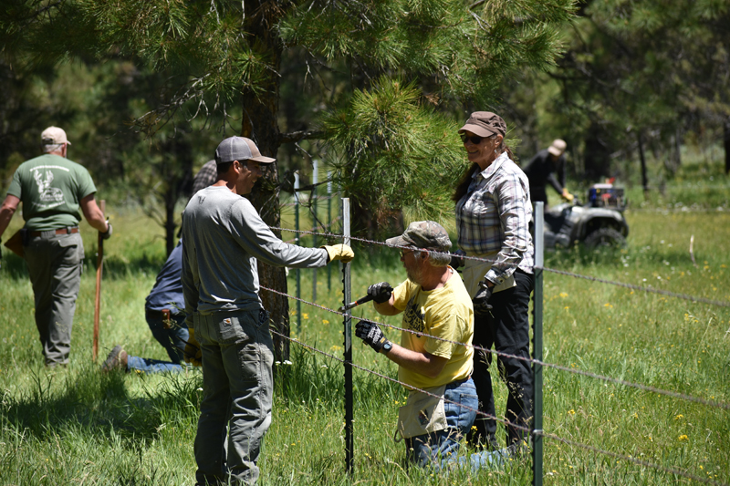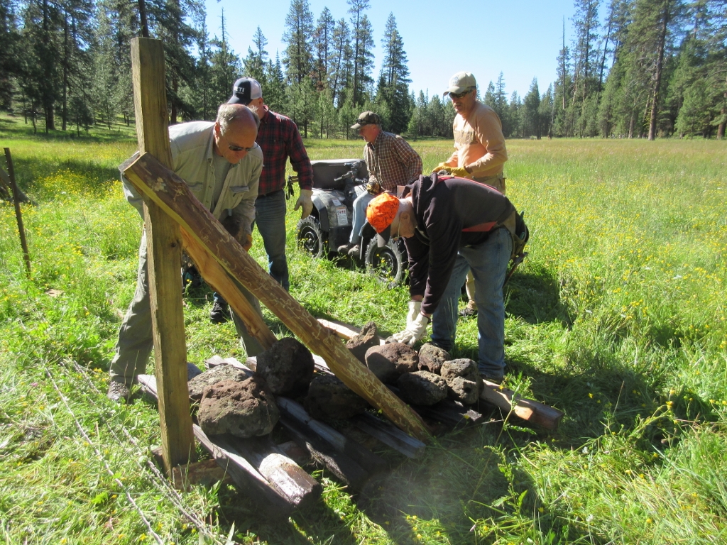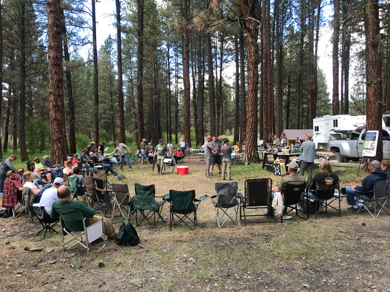 June 18 -23, 2019 saw about 79 volunteers converge on the Ochoco National Forest to work on wildlife enhancement projects. These projects consisted of building over a half mile of fence to protect meadows and aspens as well as conduct annual maintenance of several adopted guzzlers in the area. These projects were near the Salter’s Cabin and Sunflower Flats areas. Sugar Creek campground served as a base camp and headquarters for the effort.
